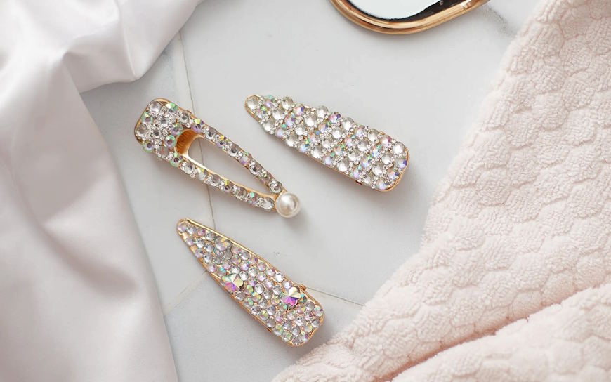 I fermagli a barretta con cristalli pavé sono i più versatili per chignon e raccolti bassi. Lineari, eleganti, si inseriscono lungo la linea del raccolto creando una sequenza di luce che segue il contorno della testa. Tre barrette di diverse lunghezze, disposte in modo non simmetrico, danno un effetto molto più sofisticato di una singola spilla grande.